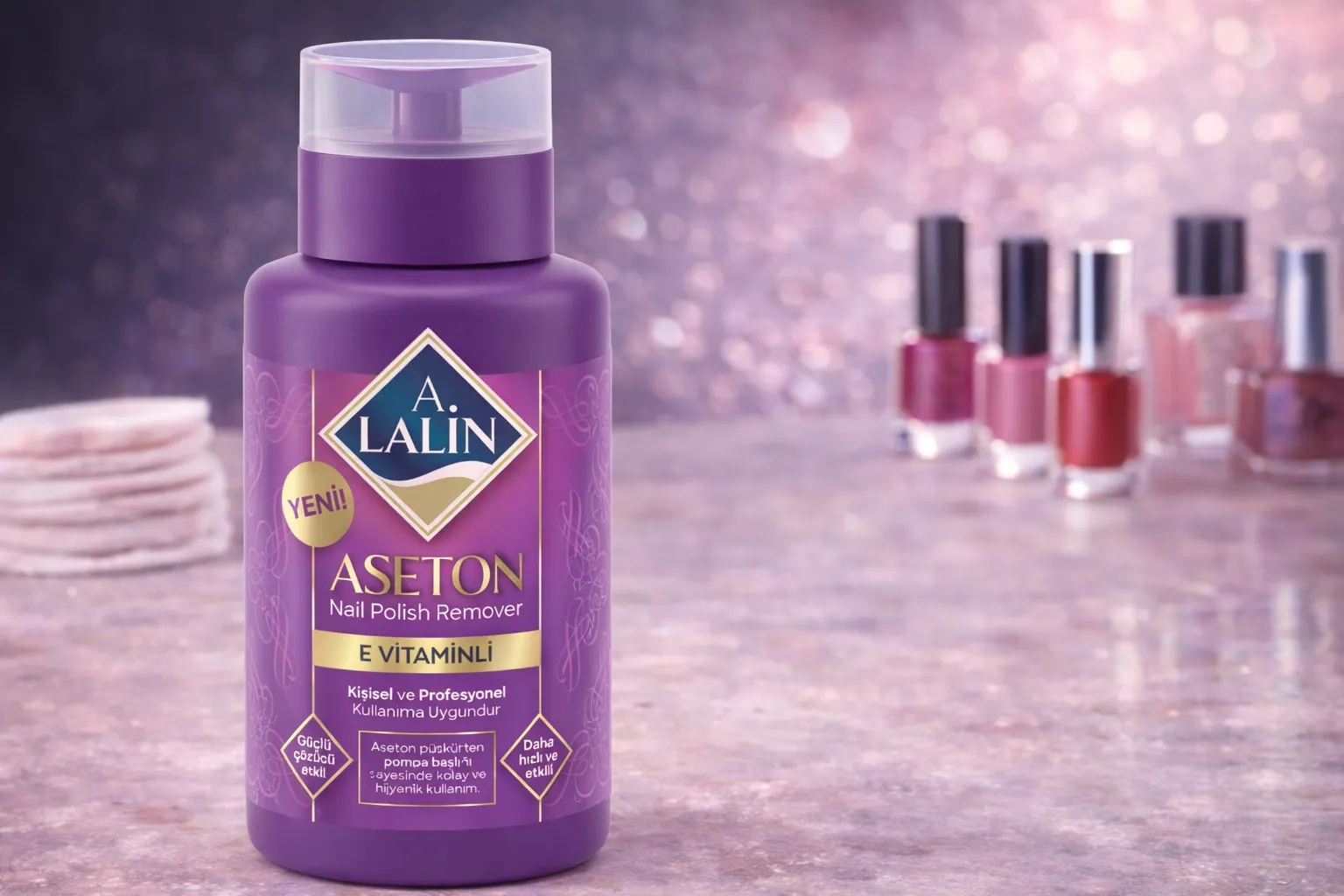 A. Lalin E Vitaminli Pompalı Aseton, oje temizleme işlemini daha hijyenik, pratik ve kontrollü hale getirmek için tasarlanmıştır. Özel pompa sistemi sayesinde pamuğa ihtiyaç kadar aseton alabilir, dökülme ve israfın önüne geçebilirsiniz.