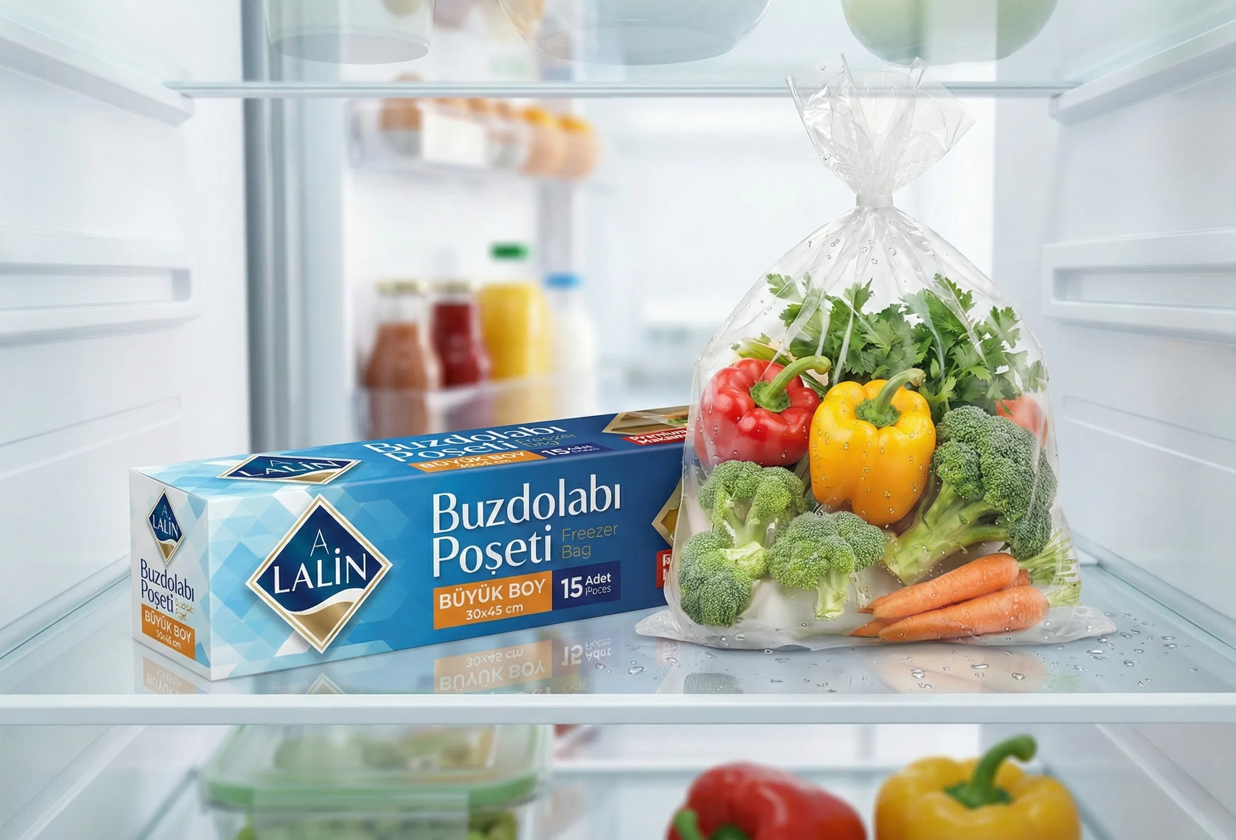 A. Lalin Büyük Boy Buzdolabı Poşeti ile gıdalarınızı israf etmeden, tazeliğini uzun süre koruyarak saklayın. Özel olarak geliştirilen dokusu sayesinde sızdırma yapmaz, gıdalarınızı dış etkenlerden ve buzdolabı kokularından tamamen izole eder. Geniş Hacim: 30x45 cm ebatlarıyla bütün tavuk, büyük sebzeler ve çoklu porsiyonlar için idealdir. Premium Koruma Teknolojisi: Gıdaların nem dengesini koruyarak kurumasını veya bozulmasını engeller. Ekonomik Paket: Kutu içerisinde 15 adet dayanıklı poşet bulunur. Çok Amaçlı Kullanım: Hem derin dondurucuda hem de buzdolabı rafında güvenle kullanılabilir. Mutfaktaki en büyük yardımcınız ile tanışın, tazeliği şansa bırakmayın.